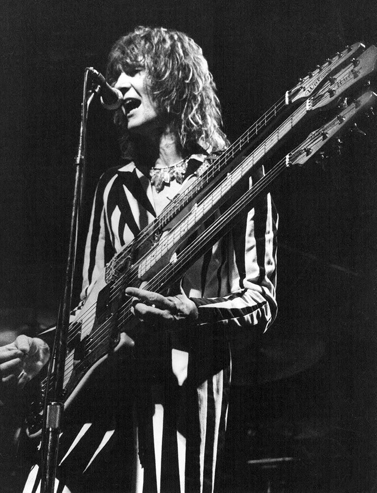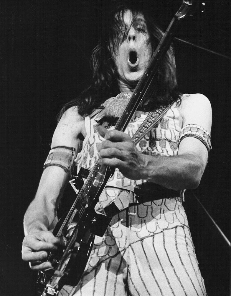 Todd Rungren bends strings and wails some high notes while looking at the camera.