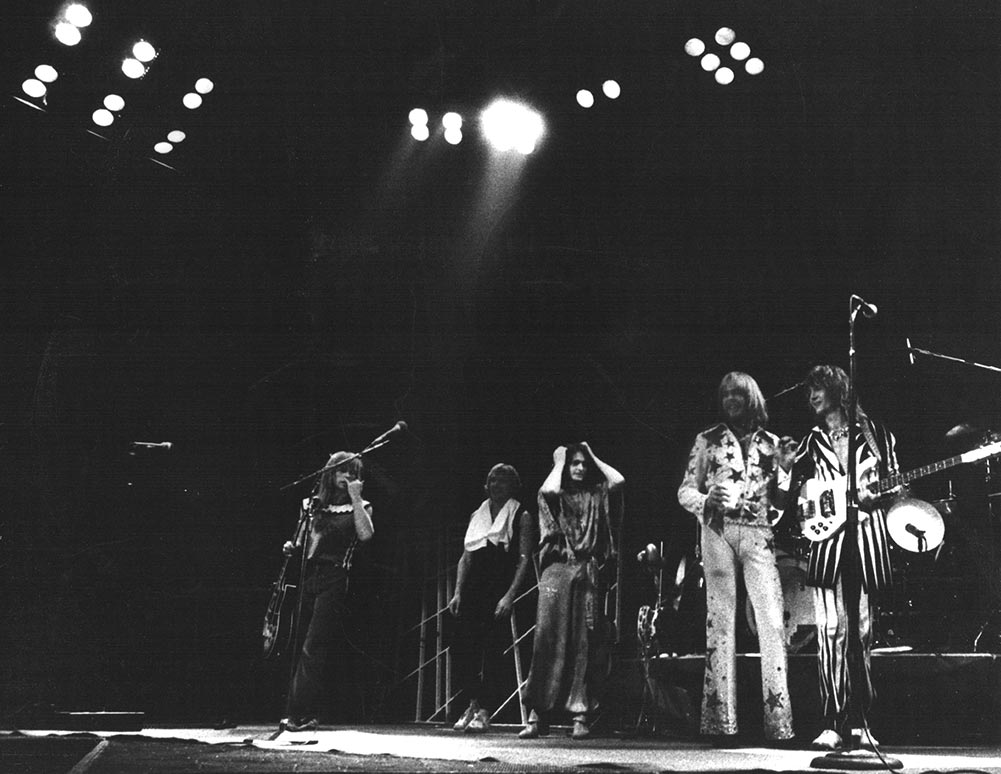 The members of Yes converge on stage after their finale. Steve Howe on the far left was my guitar hero, playing in a classical style but within rock compositions.
